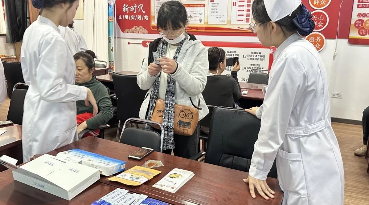 活动现场设置人参产品体验区,志愿者们向社区居民分发宣传手册,讲解人参知识。陈列的人参保健产品吸引居民们积极体验。志愿者们发挥专业所长,为现场居民提供刮痧、按摩、血压测量等基础护理服务,开展养生科普宣教,在轻松愉悦的氛围中提升了社区居民的健康认知水平。