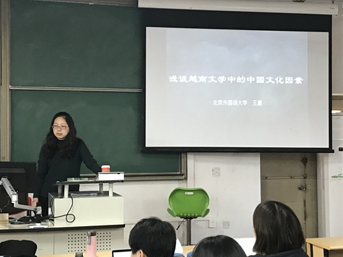 以人物典故和成语俗语为经,以越南汉文文学和国语字文学为纬,王嘉老师为在场师生展现越南文化与中国文化在文学中相交融的丰富图景。风格幽默,举例生动,王老师的讲座不时引发在场师生的阵阵笑声。王老师指出,在上千年文化交往的过程中,中国古代文学中的人物、典故已完全融入越南文学的话语,成为越南文学创作的重要素材,并在特定场合发生了含义、用法等方面的变化。越南文学对中国文学的借鉴与运用是两国人民自古以来友好交往的明证。